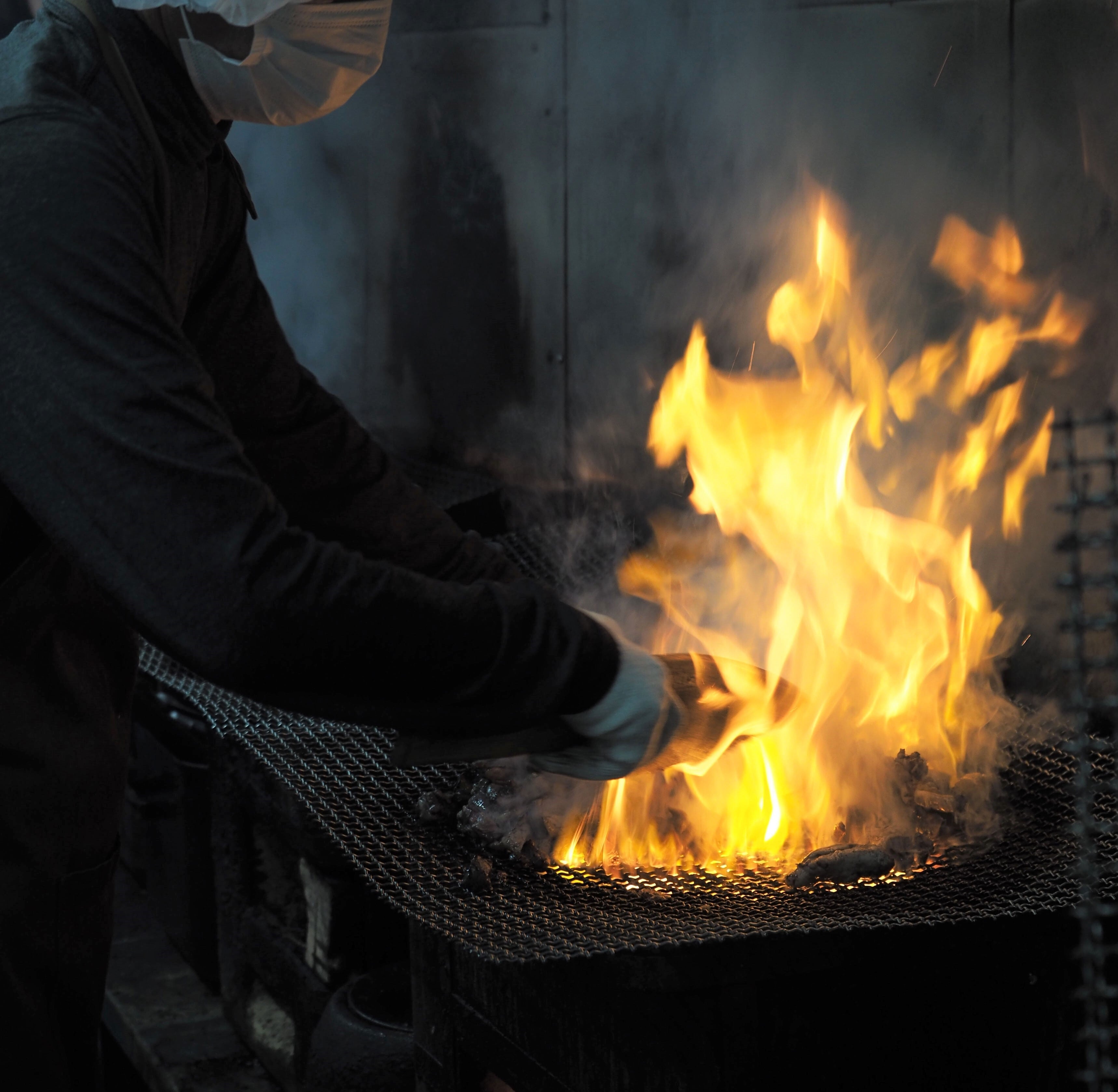 熟練の職人が国産の親鶏を大型七輪で手焼きしております。